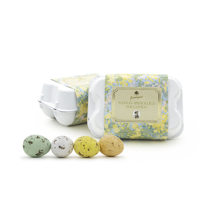 Nannas spräckliga nougatgg i en söt liten äggkartong. En perfekt & uppkattad gåva att ge bort till påsk.