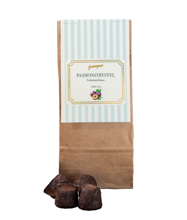 Mjuk & krämig tryffel med smak av passion, pudrad med kakao från Sockerbageriet.