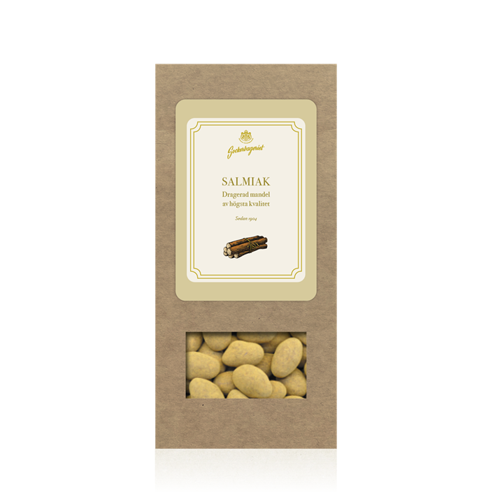 Mandeldragé av högsta kvalitet med kryddig smak av salmiak.