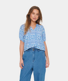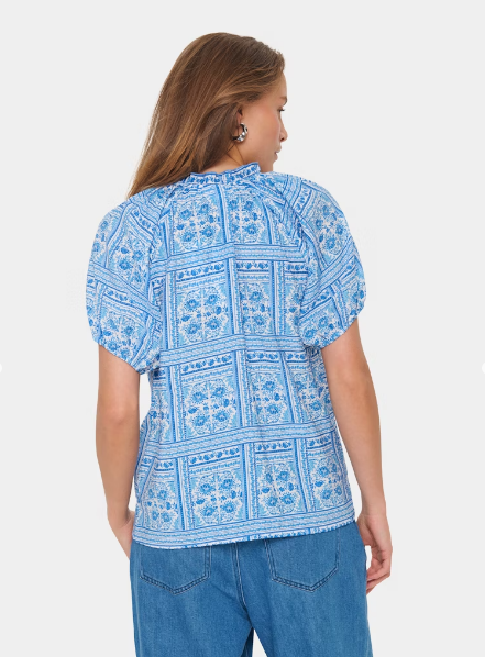 Blus i vävt tyg med blåvitt mönster och hög, rynkad krage med resår. Korta puffärmar och lös passform ger en luftig och feminin stil. Passar perfekt till både jeans och kjol.