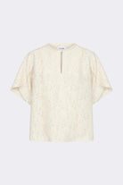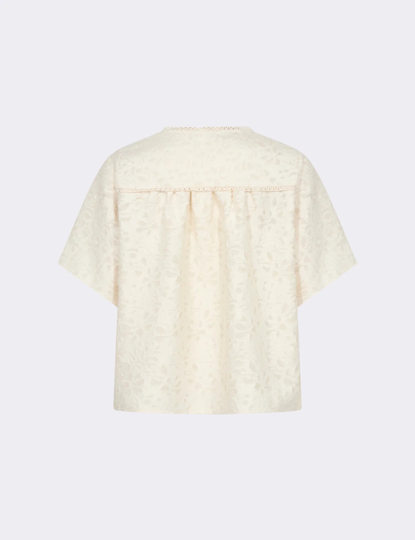 Kana är en blus som består av 45% ECOVERO viskos, 35% polyester, 20% polyamid. Blusen har en jacquarddesign med en slits i halsringningen, skulpterade detaljer längs sömmarna och en lös, flödande skärning för bekväm användning. Den kan kombineras med byxor eller en kjol för en balanserad look som passar för olika tillfällen.
