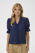 Mörkblå blus med avslappnad passform, romantisk vågig krage och dekorativ kant. Korta ärmar med lätt rynkad volang ger extra komfort. Passar flera tillfällen. Från Saint Tropez.