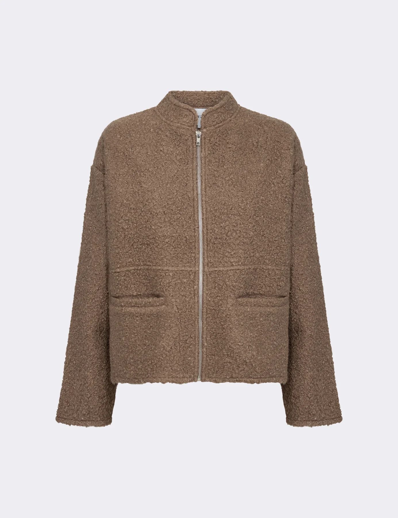 Modellen NISSA från Levete Room är en jacka tillverkad av 100% polyester. Denna jacka har en texturerad dragkedja, två fickor framtill och en ribbad krage. Passar även fint att bära som dressad kofta/jackett inomhus. Ljusbrun färg och en härligt textur likt ull/teddyfoder.
