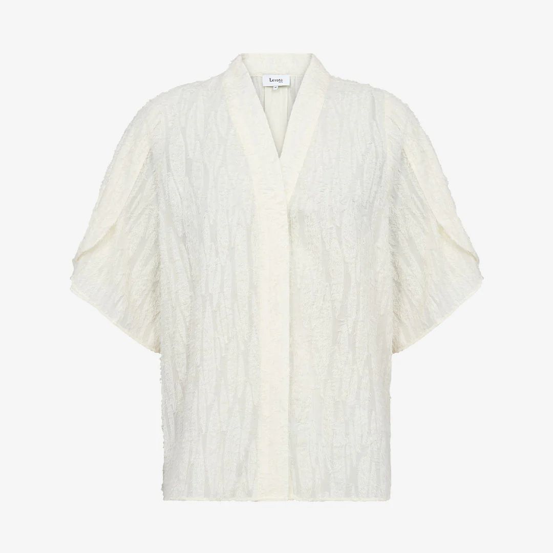 Ohanna blus från Levete Room är tillverkad av 100% återvunnen polyester. Blusen har en mjuk textur med v-ringning, korta ärmar och ett subtilt vävt mönster. Kombinera den med skräddarsydda byxor eller en kjol för en elegant look.