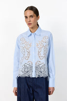PIPPIN är en unik skjorta tillverkad av 70% bomull, 27% nylon och 3% elastan från Levete Room. Den har en klassisk krage, knappstängning framtill, en unik spetsdesign och ett vackert kritstrecksrandigt tryck. Denna eleganta skjorta passar utmärkt till skräddarsydda byxor eller en elegant kjol för en sofistikerad look.