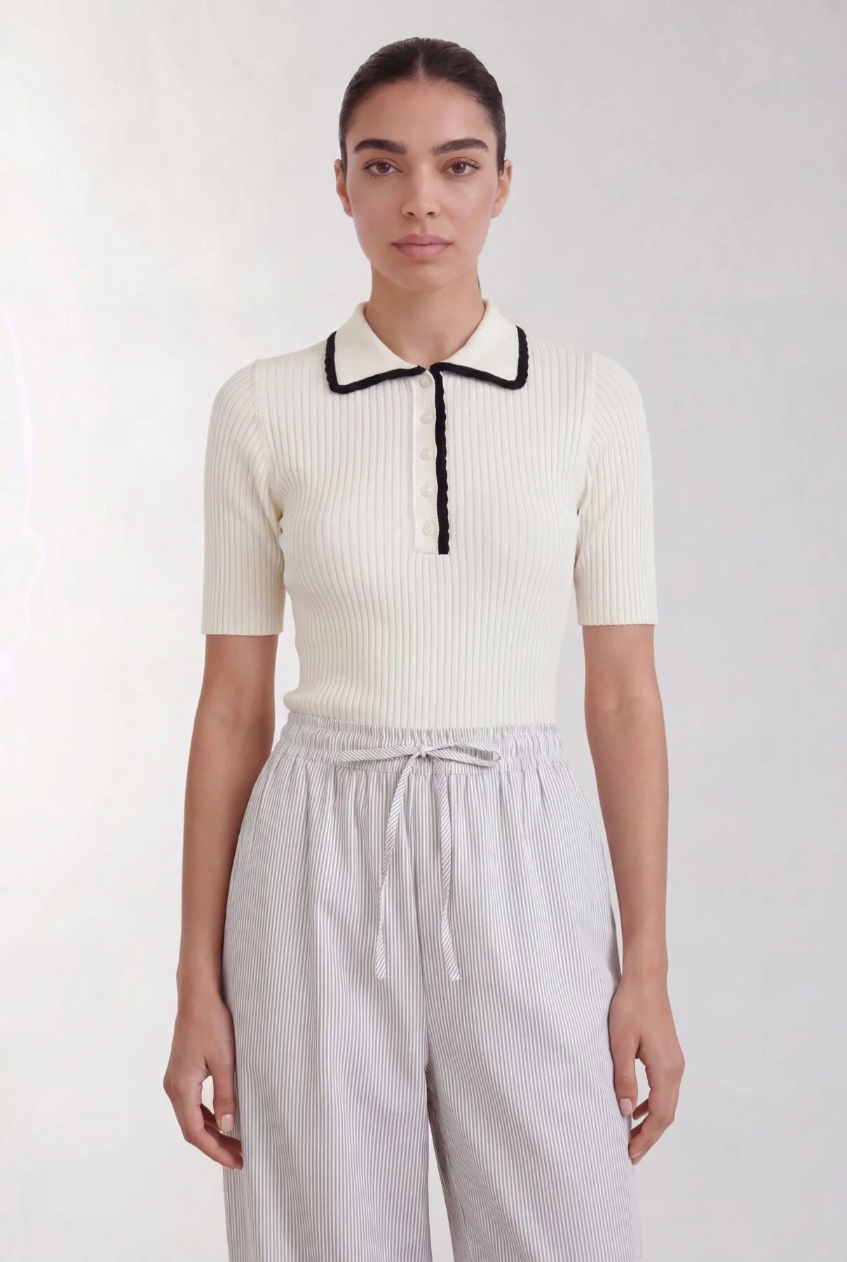 LR-RYDE 1 från danska Levete Room är en tunnstickad kortärmad topp tillverkad av 80% LENZING™ ECOVERO™ viskos, 20% polyamid. Den har en ribbad textur, knappslå framtill och en kontrasterande skulpterad krage. Kombinera den med skräddarsydda byxor för en sofistikerad look.