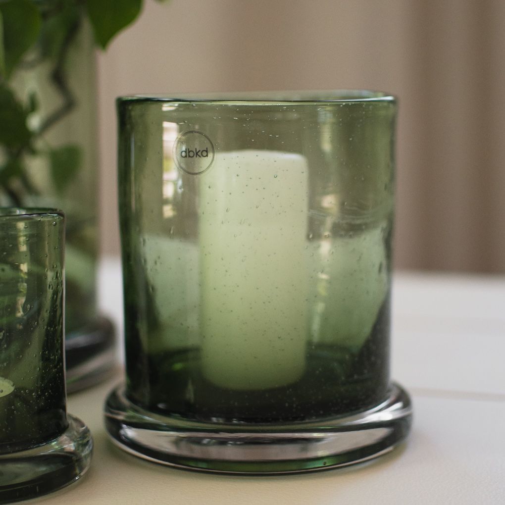 Ljuslykta eller vas från DBKD i grönfärgat glas med bubblor i. står stadigt då den är lite vidare nedtill.