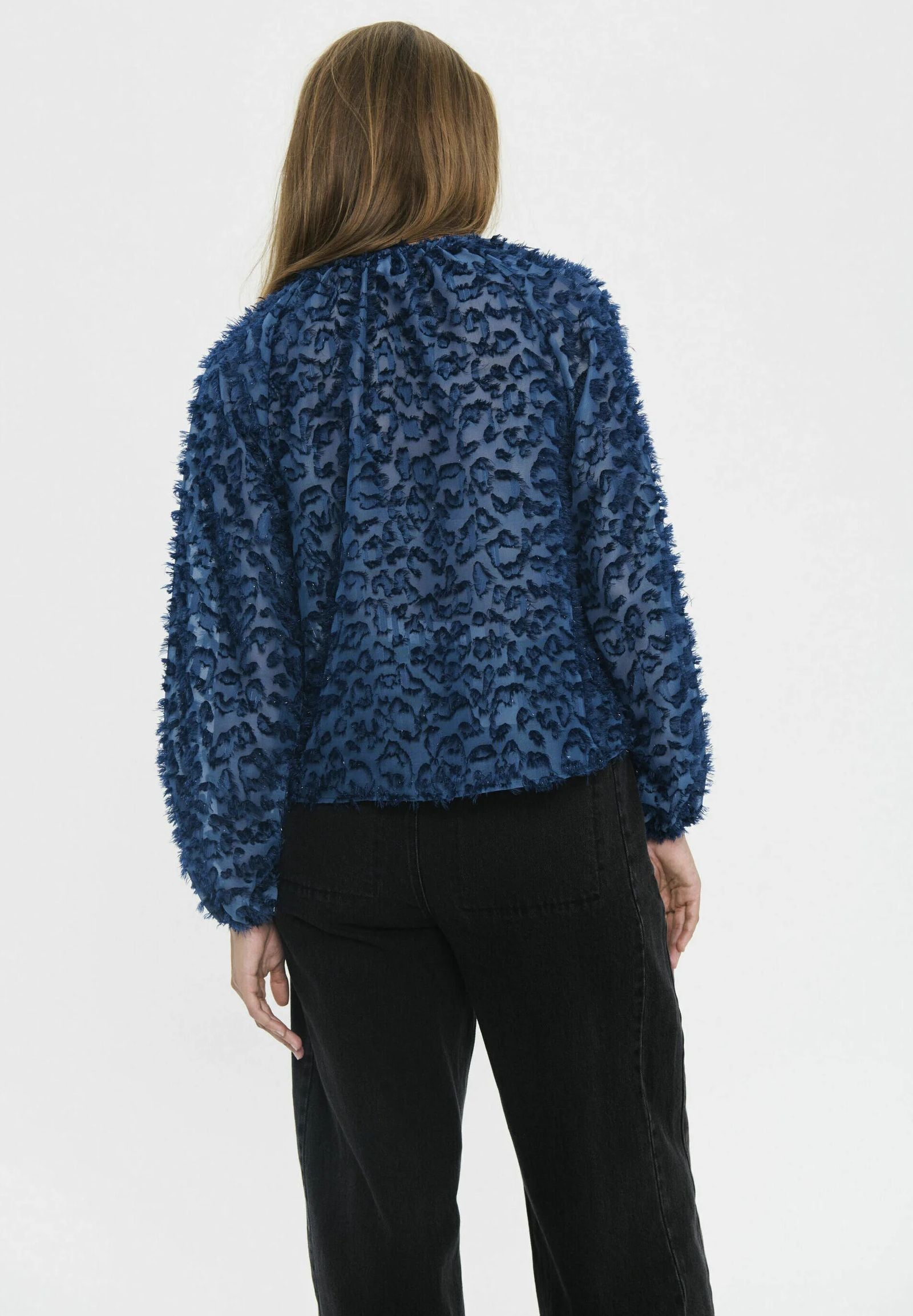 Blus med lång ärm och genomgående strukturmönster. Rak passform och rund hals med liten knapp framtill. Ärmsluten är något rynkade. Längden slutar vid höften och inga synliga detaljer utöver mönstringen.