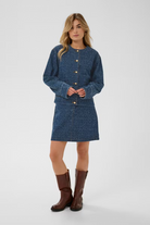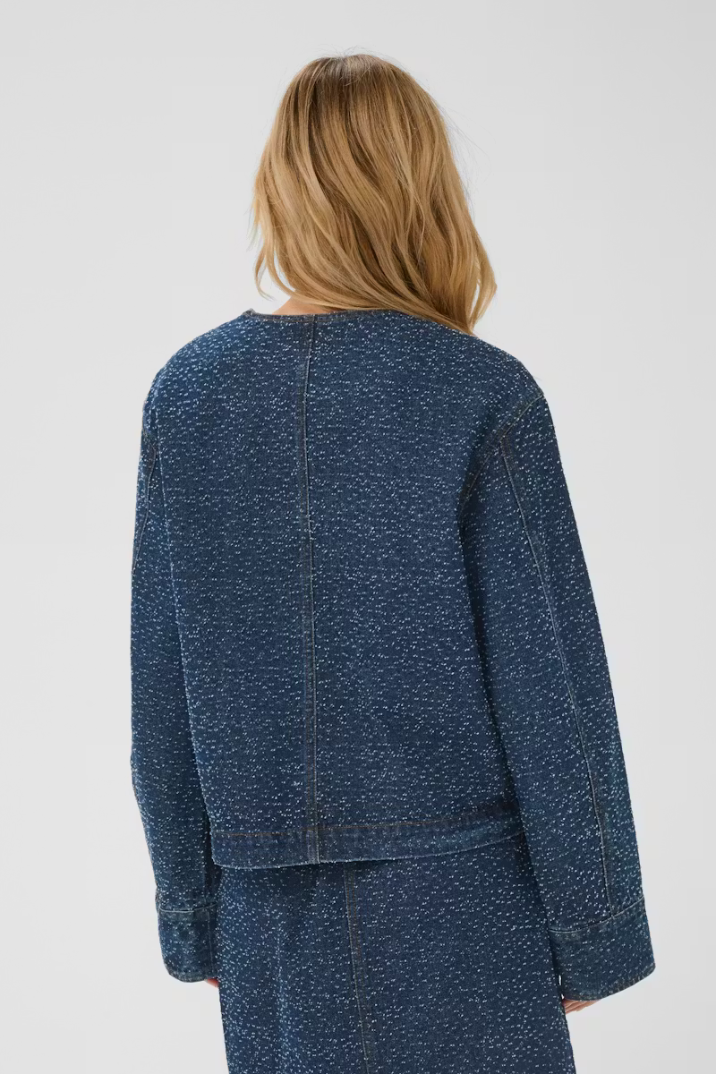 Denimjacka med texturerad yta, rak och boxig passform samt rund halsringning. Stängs med iögonfallande metallknappar framtill och har två påsydda fickor samt långa ärmar med synliga stickningar.