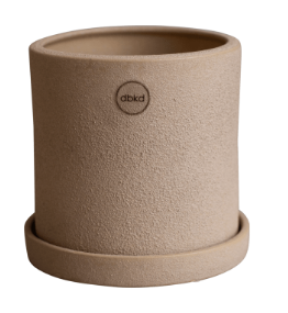 Kruka med klassiskt men ändå modernt uttryck från DBKD. Rund form med tillhörande fat. Dräneringshål i botten. Tillverkad i keramik med en sand kulör och skrovlig finish. Stilfull med alla olika sorters växter i.