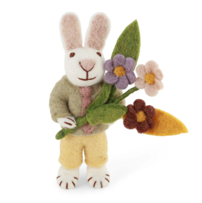 Den vita haren med grön kavaj, slips och en bukett med tre blommor är en elegant och charmig påskdekoration. Den är handgjord med stor omsorg och utstrålar både stil och värme. Med ett band för upphängning kan haren enkelt placeras i påskris, på en gren eller som en del av en festlig dekoration. 100% Fair Trade.