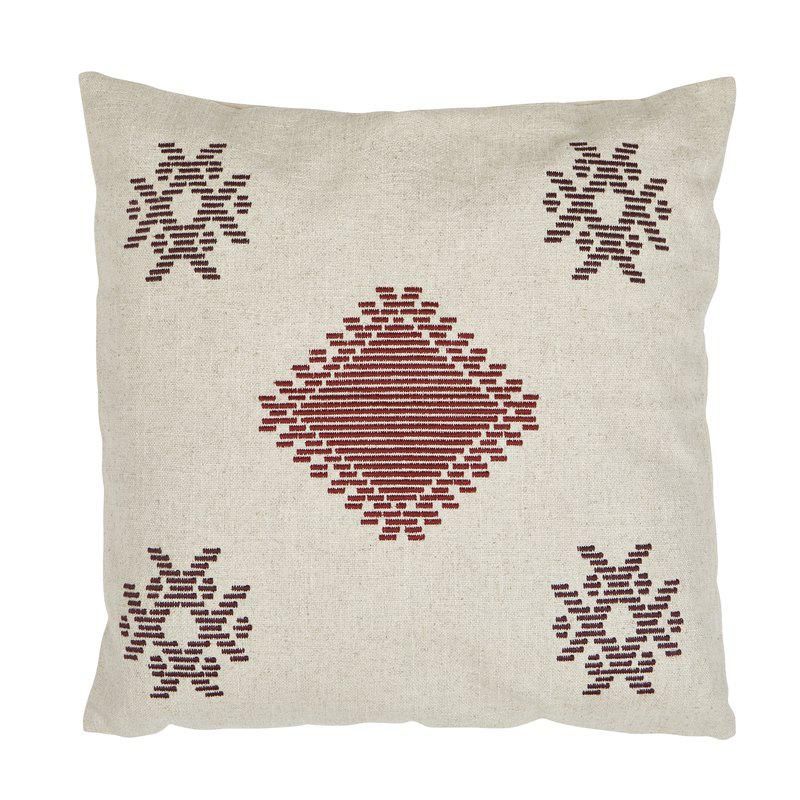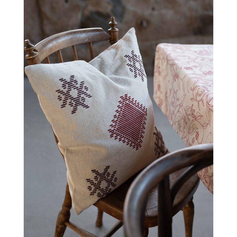 Kuddfodral i en vacker bomull/lin-blandning ger en naturlig, lite rustik känsla med en sofistikerad touch. Materialet kombinerar bomullens mjukhet med linets struktur, vilket ger en fin balans mellan komfort och karaktär. Det broderade mönstret tillför en handgjord känsla och ett stilrent uttryck.
