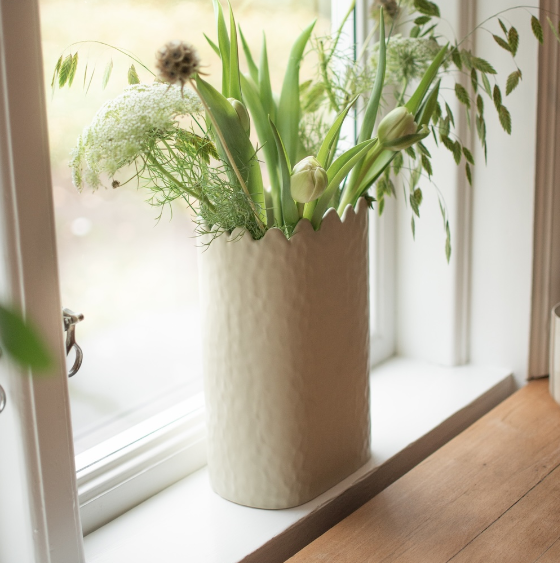 Flowery vas i keramik har en lätt strukturerad yta och en dekorativ, vågig kant med inspiration från blomblad perfekt för snittblommor och grenar. Från DBKD.