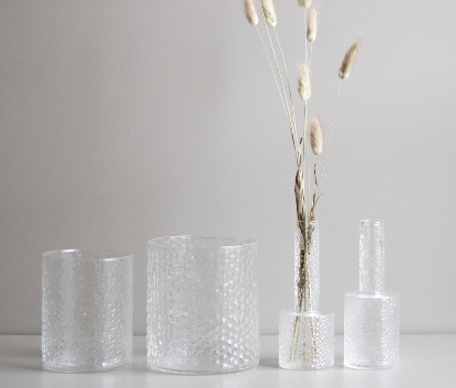 Airy vas smal klar från svenska DBKD är en stilren vas med bubblig yta. Blomvasen är med sin breda kropp och smala hals, perfekt till en enstaka stjälk eller kvist.