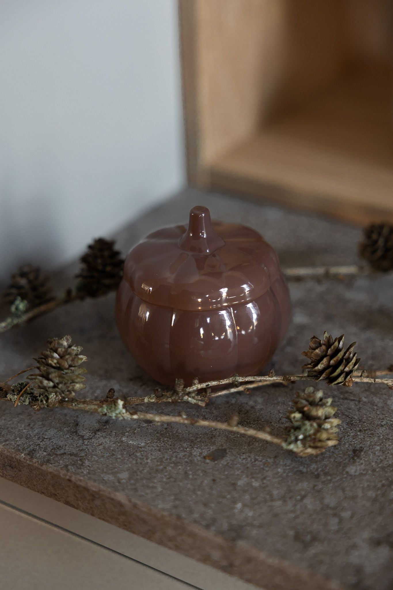 Glasburk i form av en pumpa. En både vacker och funktionell detalj, perfekt för att förvara godsaker, snacks eller som en dekorativ prydnad.