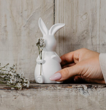 Dekoration i keramik. Emilia är en söt kanin som passar fint med resterande påskdekorationer i kollektionen. Emilia kan dekoreras med en fjäder eller blomma som man kan sätta i hennes hand (levereras utan dekoren som visas på bilderna).