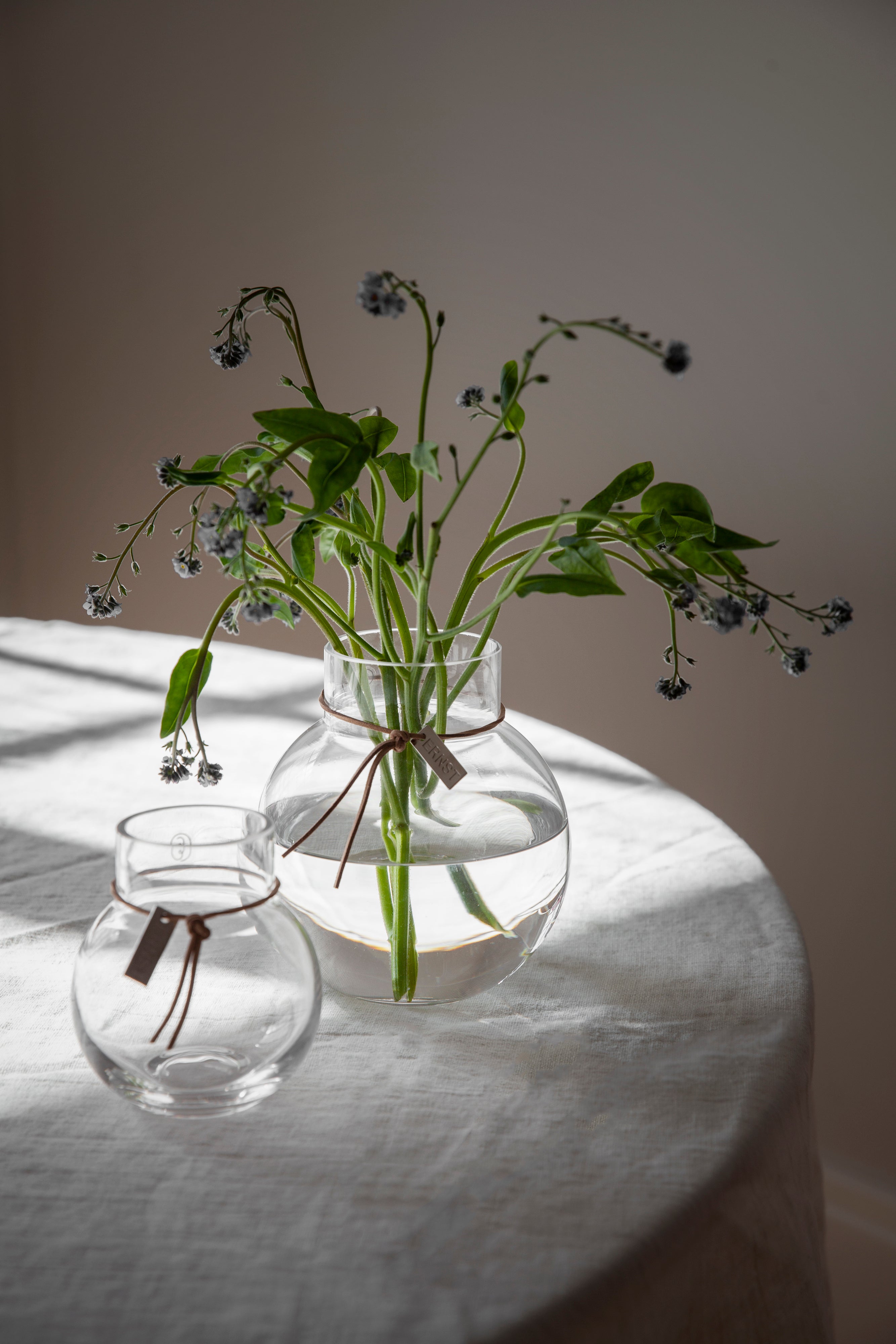 Snittblommor skapar liv och glädje i varje hem. I ERNST populära runda vas med läderband kan du skapa vackra blomsterarrangemang. Tack vare vasens storlek går den även att använda som ljuslykta.