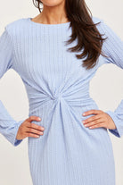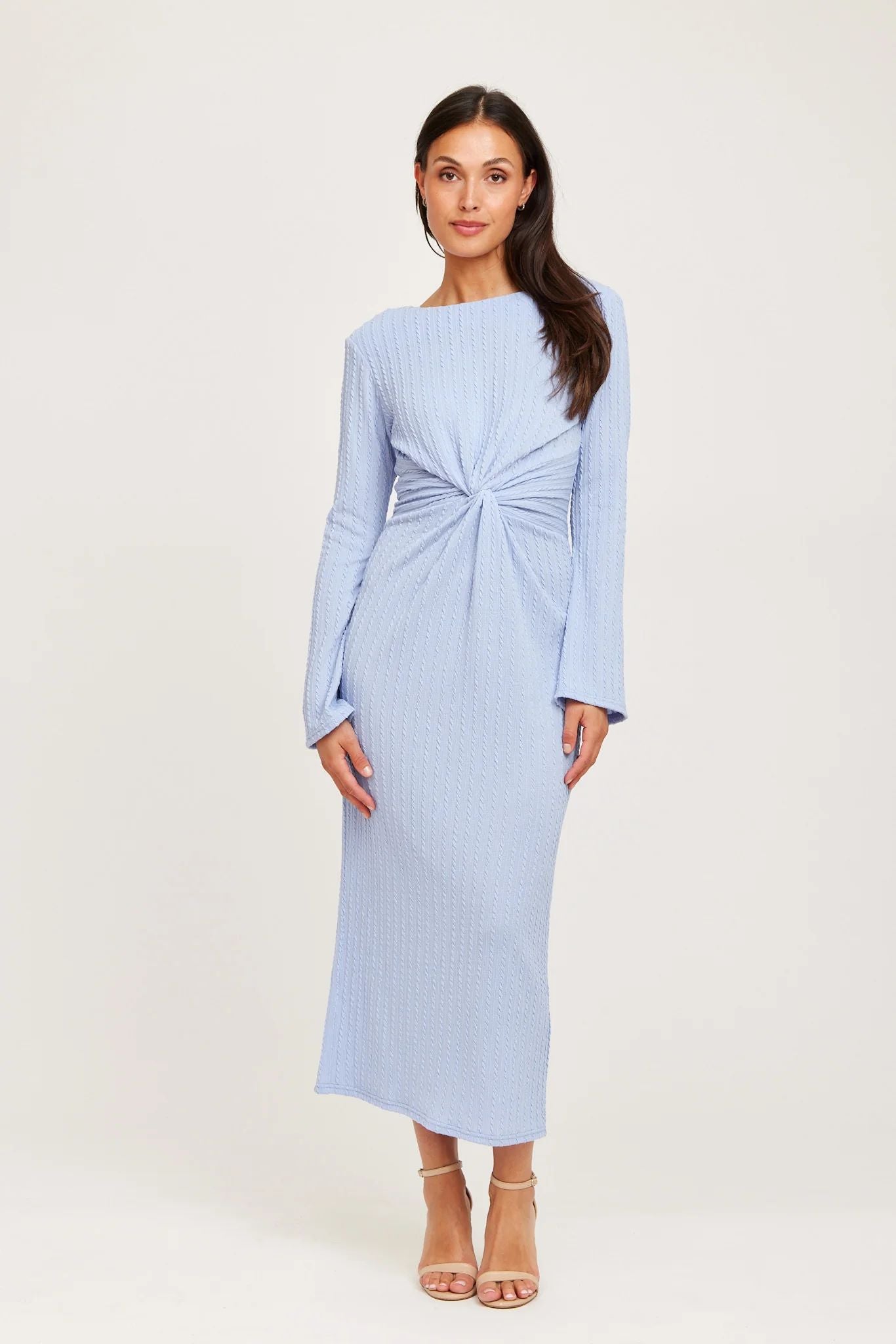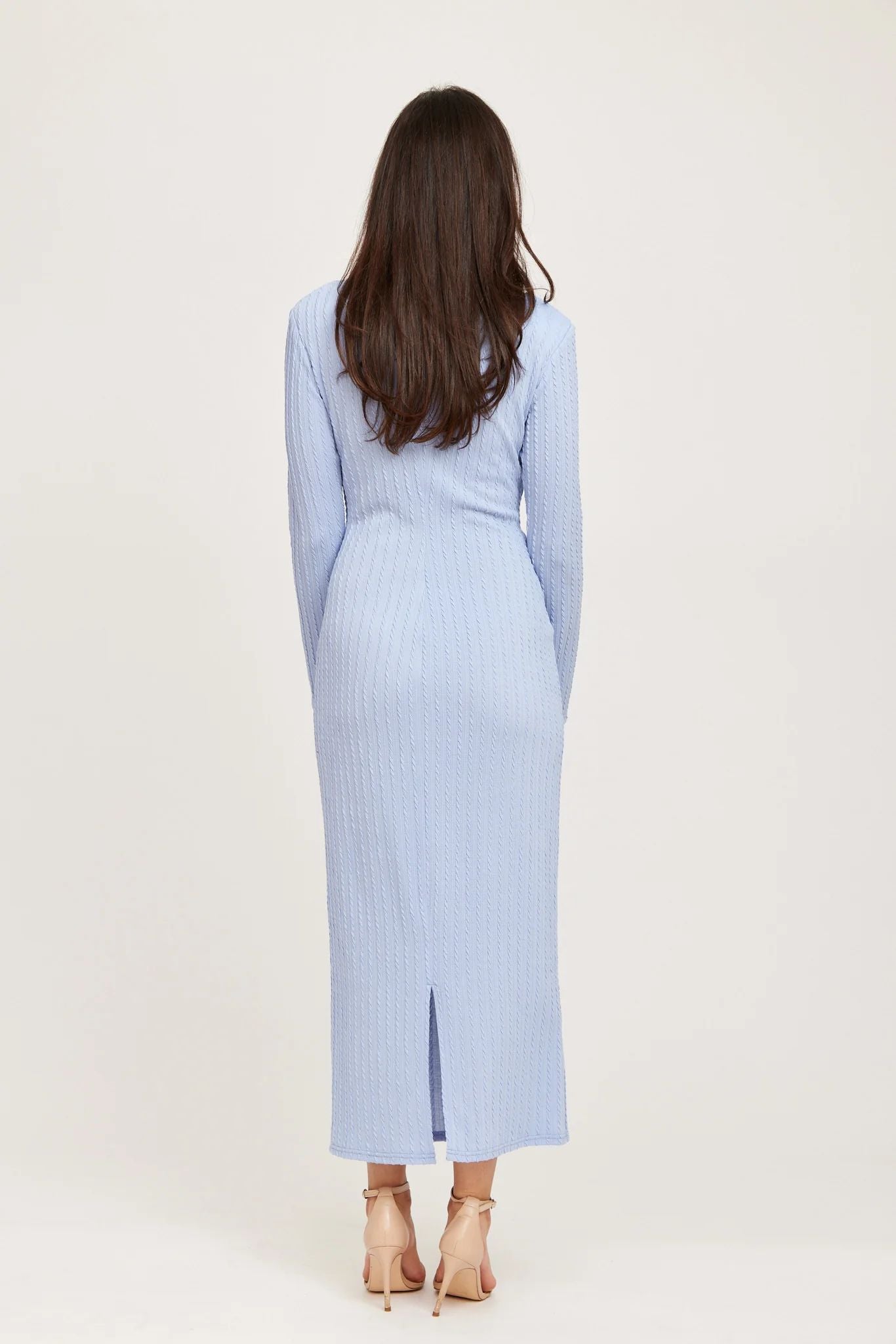 En elegant, långärmad maxiklänning tillverkad i ett mjukt ljusblått tyg. Designad med smickrande, vridna detaljer framtill som framhäver midjan, erbjuder detta eleganta plagg en raffinerad, feminin silhuett som är perfekt för både speciella tillfällen och elegant vardagsbruk.