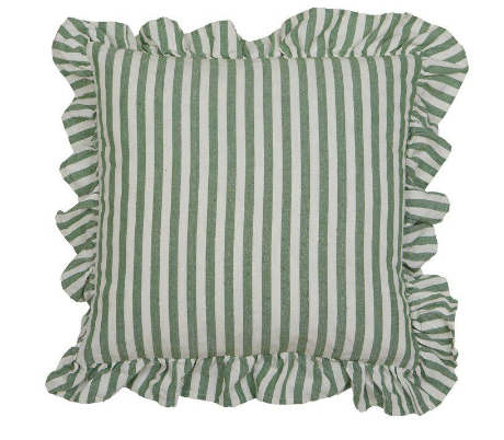 Kuddfodral från Fondaco med gröna ränder på en naturvit botten. Romantiska volanger runt om.