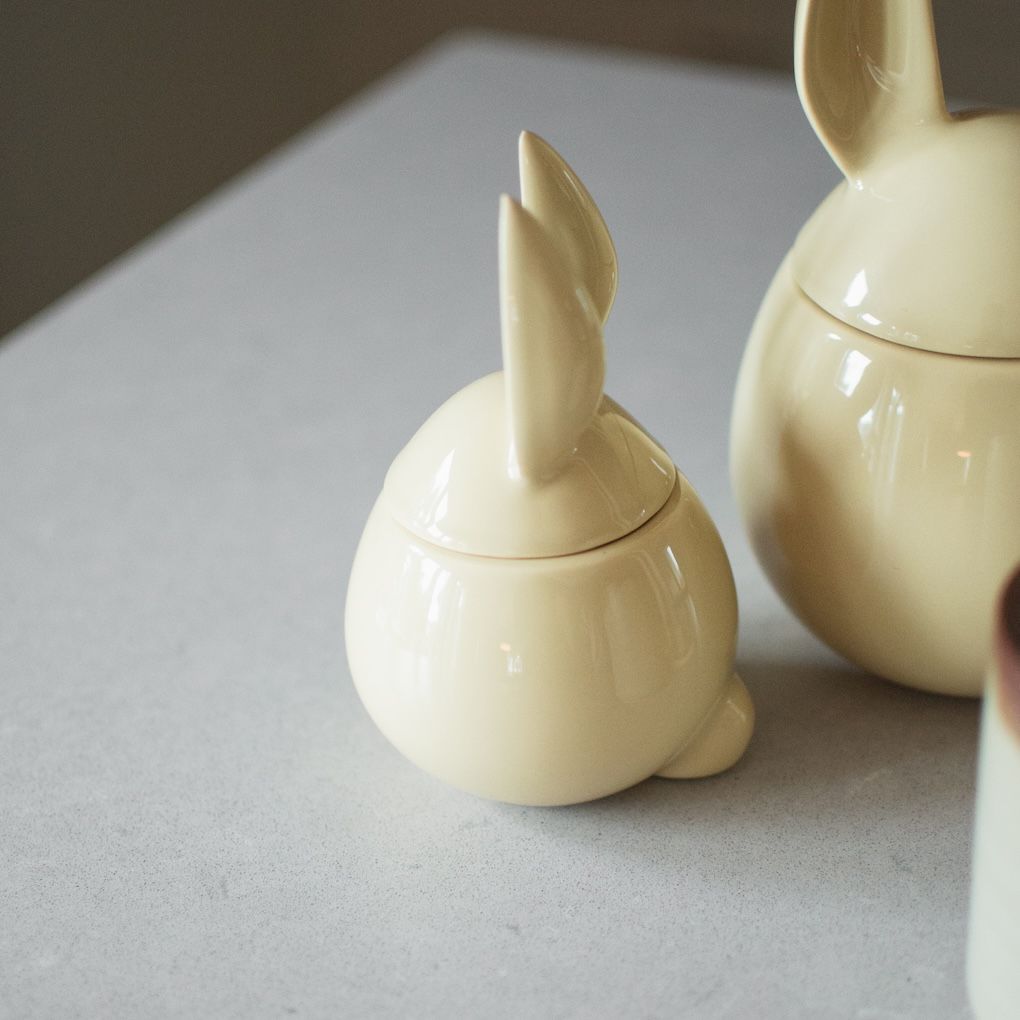 DBKD Eating rabbit skål liten är tillverkad av keramik och kan användas både som förvaringsburk för småprylar och som serveringsskål för påskgodis. Tack vare det smarta och söta locket håller sig godiset fräscht längre. Den mjuka och minimalistiska silhuetten med två kaninöron är en modern tolkning av den klassiska påskharen och blir en charmig dekoration på bordet eller fönsterbrädan under påsk.