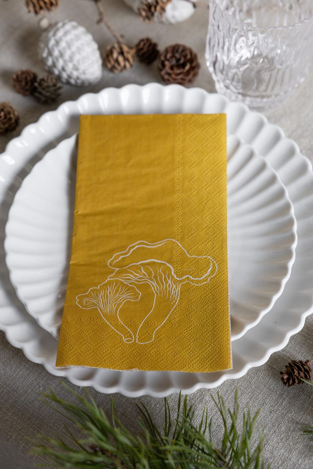 Pappersservett med motiv av kantareller på gul botten som ger din dukning en liten extra detalj. Lika vacker i vardagen som till festen. En förpackning innehåller 16 servetter. Tillverkade i Tyskland.