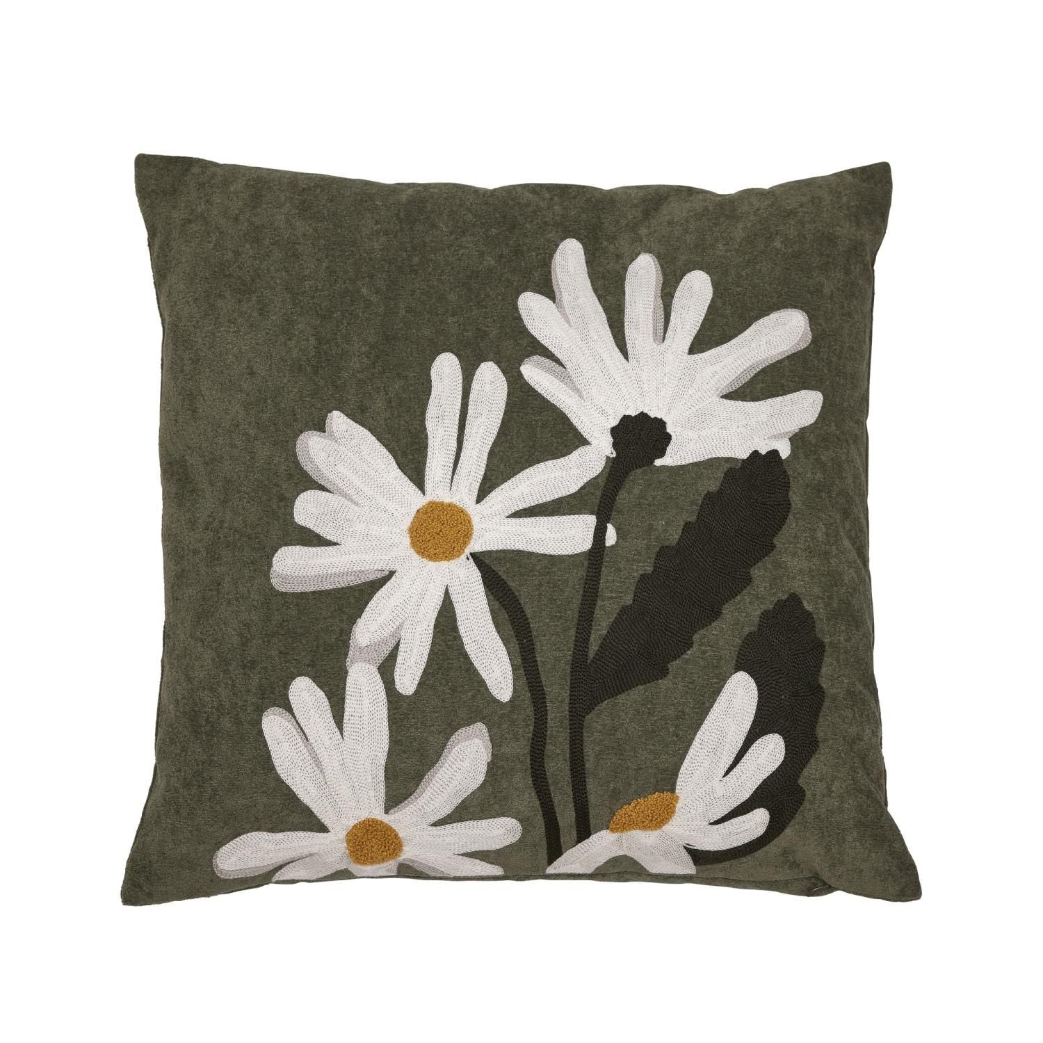 Ett stilrent kuddfodral med stora, broderade blommor i vitt och gult som blir en elegant och iögonfallande detalj i rummet. De broderade motivet ger en känsla av hantverk och lyx, medan det gröna sammetslena tyget skapar en mjuk och behaglig känsla.