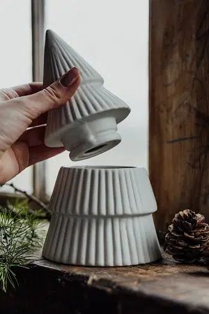 Dekorativ gran i matt keramik. Granen består av två delar, vilket ger dig möjligheten att vara kreativ. Fyll den med godis eller dekorera den med granris. Passar ensam eller i grupp med Storefactorys andra juldekorationer.