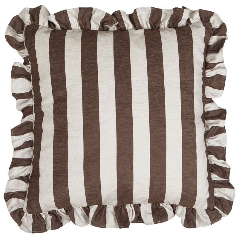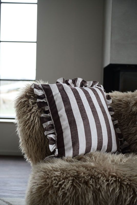 Randigt kuddfodral med sammetseffekt, som kombinerar elegans och mjukhet på ett stilfullt sätt. Kuddfodralets vackra lyster fångar ljuset och ger rummet en varm och inbjudande känsla. Det är även dekorerat med en volang runtom, vilket tillför en romantisk och dekorativ touch. Från Fondaco.
